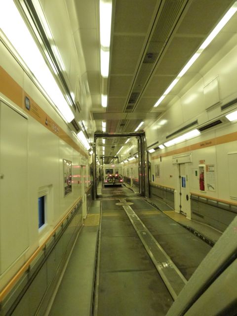 This is Mavis driving into the belly of the train…pretty much like heading in to a starship…lots of bright lights and aluminium…. We warped through under the channel in about 30 minutes and had time for a leisurely breakfast. There is not a lot to see out of the windows. Just a few fish swimming by. Pleasingly we popped up in France, as planned, and set off South directly, via the non peage roads.