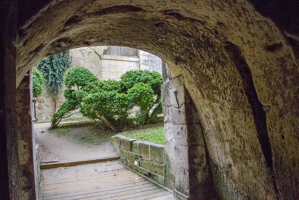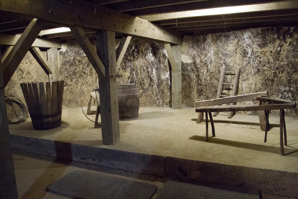 There is an exit into the 60 foot deep dry moats surrounding the Chateau. These are the deepest dry moats in Europe and a number of further caverns lead off from the moat to provide storage and working spaces.