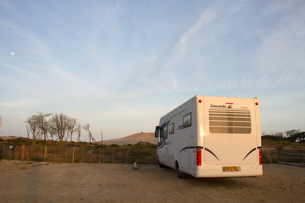 The Ferry drops you off at Verdon-sur-Mer, which is at the tip of the Médoc, the rich wine growing region to the Northwest of Bordeaux. We drove to Soulac sur Mer, about 6 miles South of Verdon, on the Atlantic coast, and stopped in an aire about 50 yards from the sand dunes and the beach.