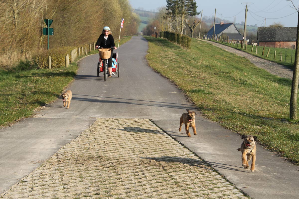 Thanks for the heads up about the flag, although I wasn’t aware that I had it upside down – indeed I have to admit I hadn’t even considered whether it had an up and a down but will remedy immediately. It is fair to say that I am sometimes in distress on a bike ride after a few kilometres and a steep hill pulling the cart and 3 dogs … and that is with the help of my bike’s battery! Luckily we found a wine bar in one of the disused stations on the cycle track and a glass of vin blanc goes a long way to restoring my good humour.