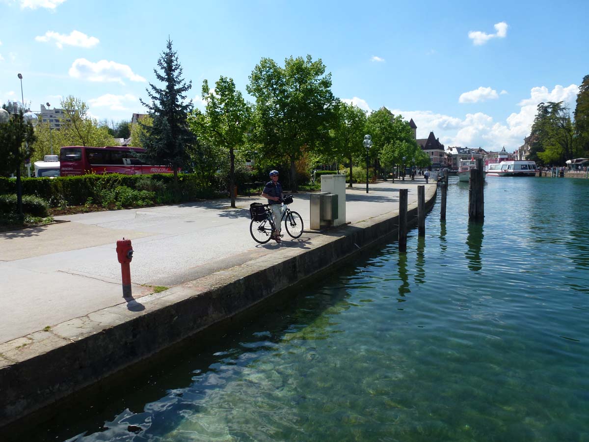 Yesterday we cycled along the well maintained two wheel only voie verte (cycle track) to the town of Annecy. It is an easy and level 10 km ride. There is quite a bit of traffic, a mixture of high speed lycra clad experts, a few rollerbladers and an assortment of out of condition middle aged puffers. Guess which group we are in.
