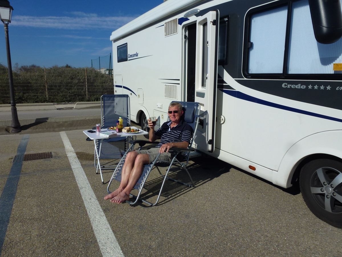 This is a long and narrow site just behind the sea wall and promenade, with good access to walking and cycling about 400 metres further east along the seafront road. There is a second section to this aire, pretty much on the beach, about 300 metres further on. This was full when we arrived so we just planted ourselves on the bigger site. It is 10 euros per night wherever you pitch and water is available but only in the morning.