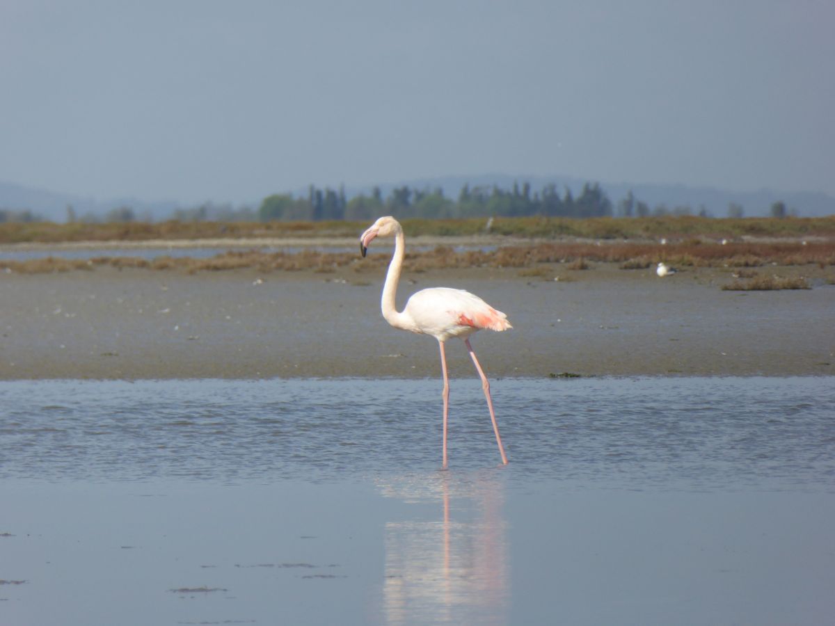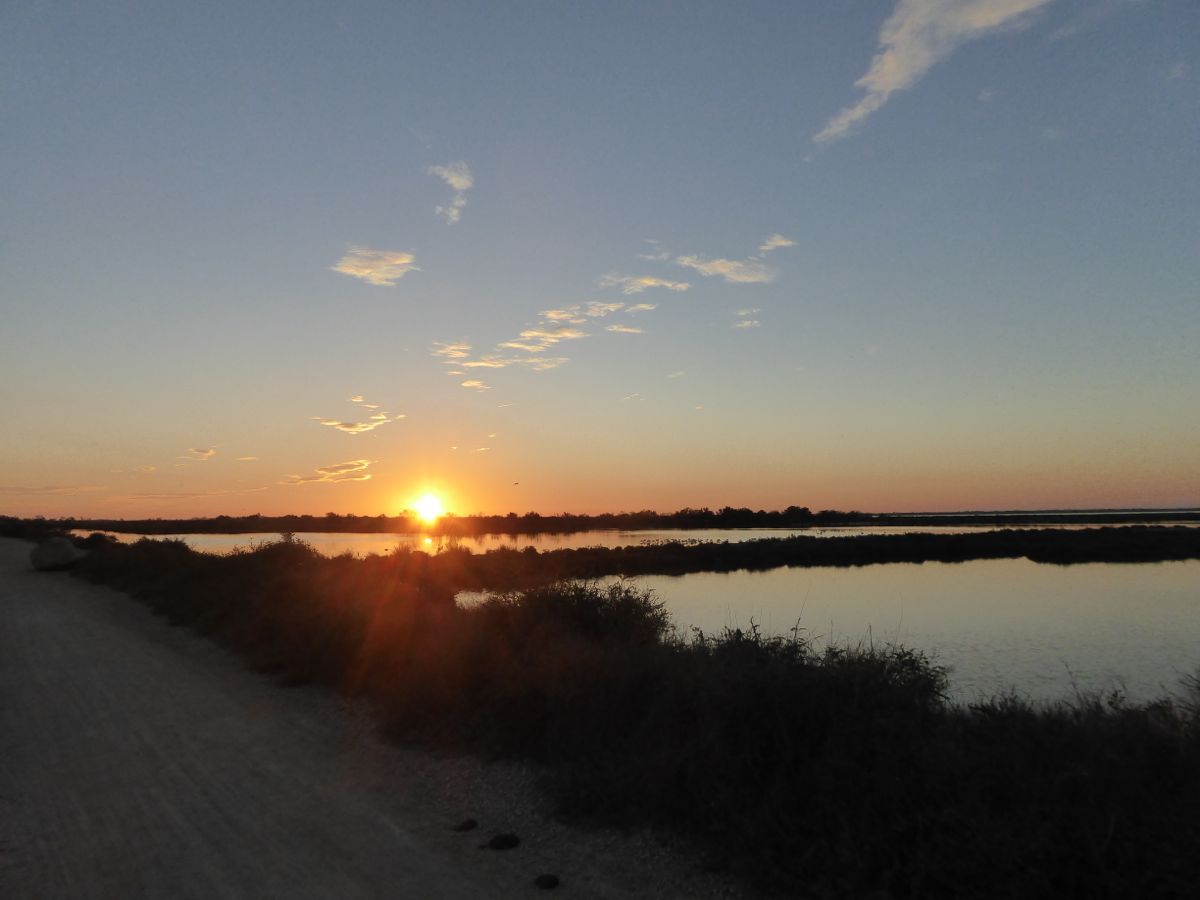 After a quick tour of Saintes-Maries we headed back past the aire and into the nature reserve which starts just beyond the town. It is a flat expanse of scrub punctuated with salt pans and brackish channels. There are birds everywhere.