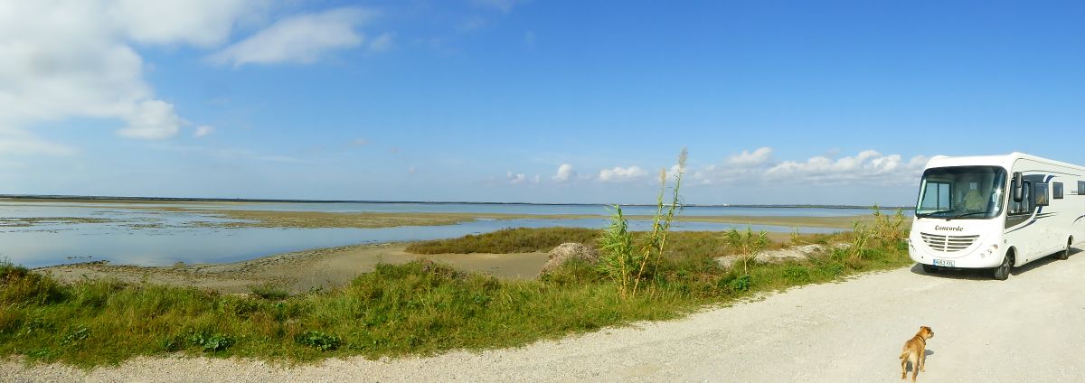 On Sunday morning we set off early…12.30 pm…for the chain ferry at Bac de Barcarin. This is a vehicle ferry at the mouth of the Rhône which cuts out the 40 mile drive up to Arles then back again, if you are working your way along the coast. However the guy on the ferry had his feet up and as a friendly tractor driver told us, the ferry was shut from 12-2. We headed back and took a left towards Piémanson beach, then stopped for lunch by a salt pan.
