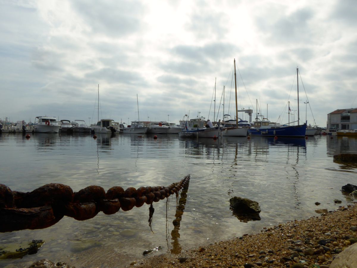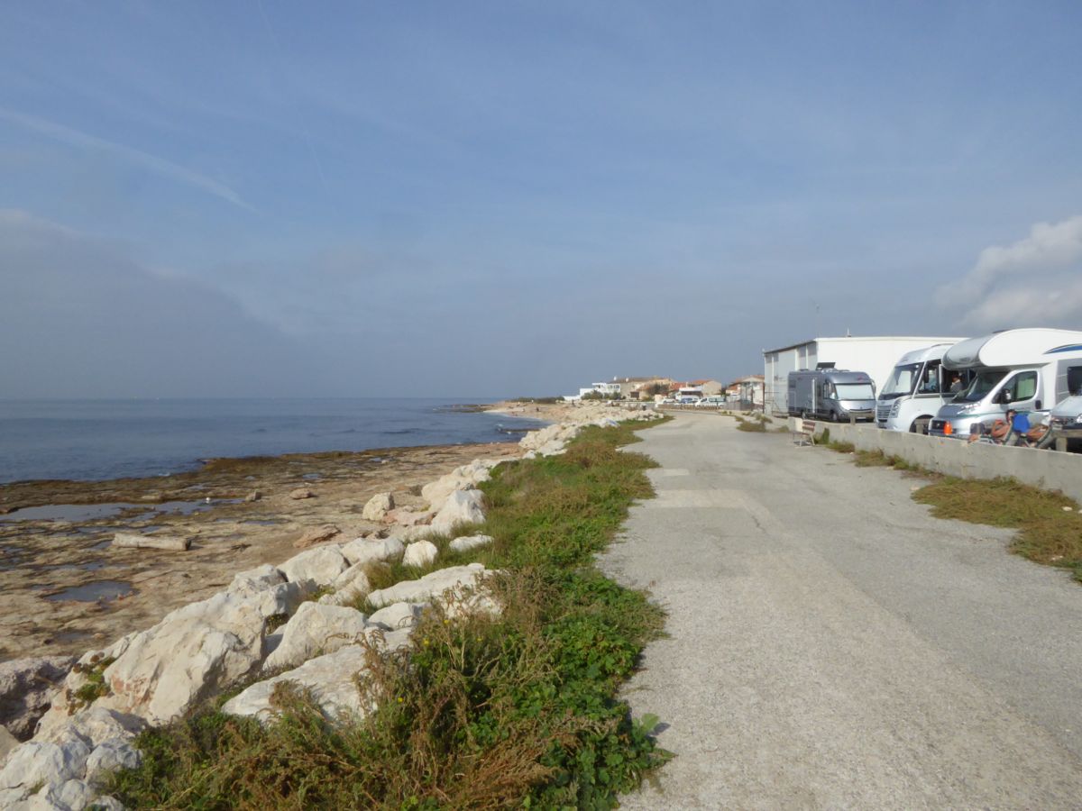 We are now on a little coastal aire ( N 43.329353 E 5.0403 ) at Carro, which is a tiny fishing port close to Martigues, and about 30 miles to the west of Marseille. Entrance is via a credit card controlled barrier and it is €8 per night. We are parked looking west, very close to the sea.
