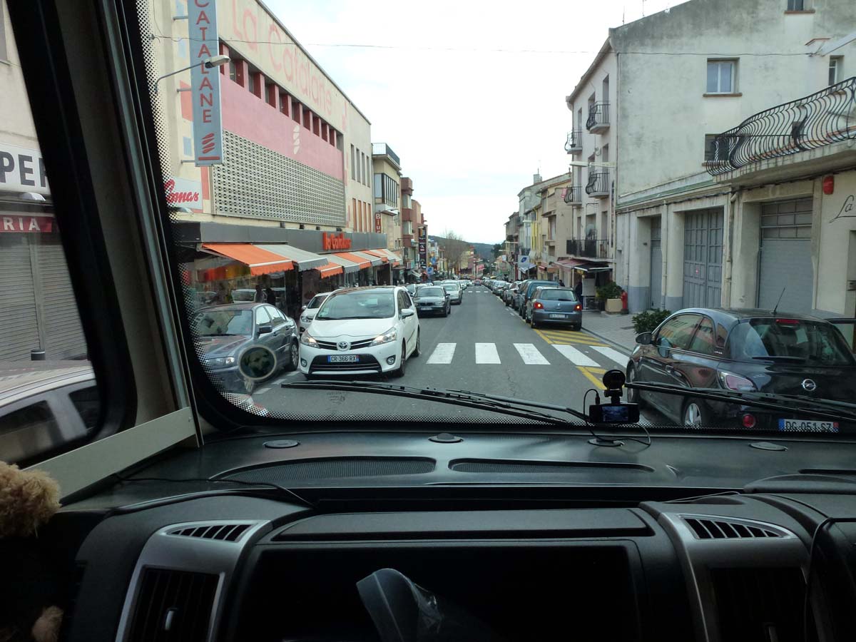This is the border town of Le Perthus…full of Sunday afternoon shoppers nipping over the border for a bargain and very busy. There were long tailbacks heading back into France from Spain. Next time we’ll take the péage for that section. It was very tight in the town but we didn’t lose any paint.