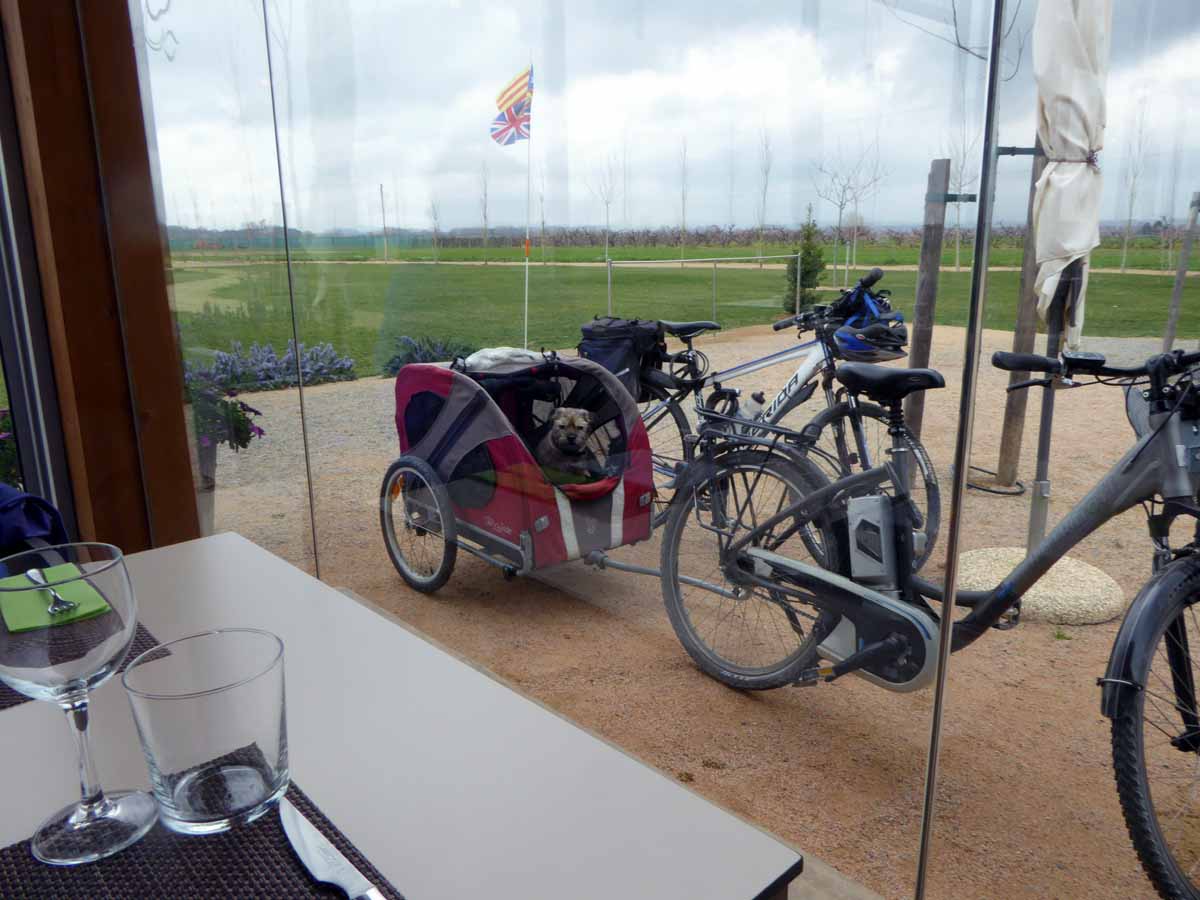 Colin and Penny had to sit in the dog cart, just outside the restaurant, while we ate. They weren’t impressed, but a couple of small spanish girls came out after a while to play with them which did take their minds off their greedy owners.