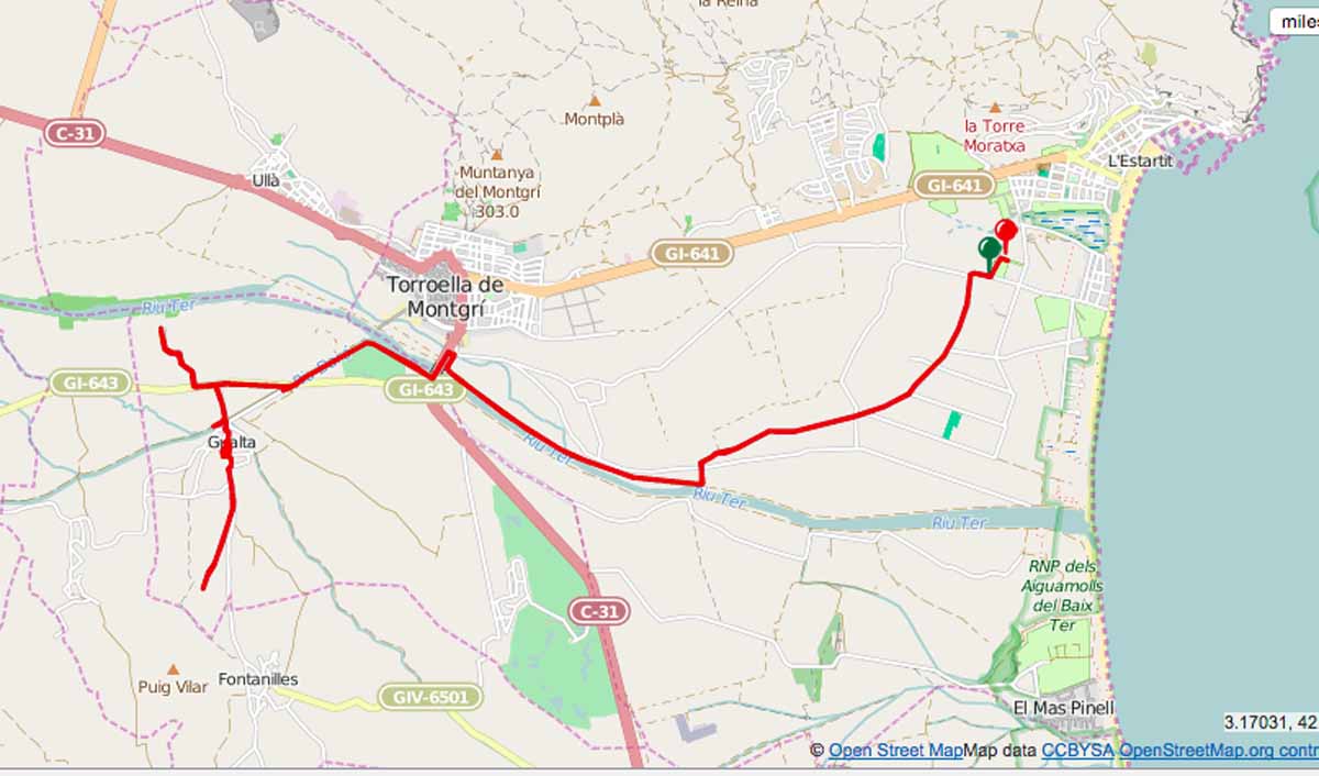 The cycle path along the river leads to the main road from Toroella to Pals. Crossing this you can carry on next to the river until you reach the small village of Gualta.