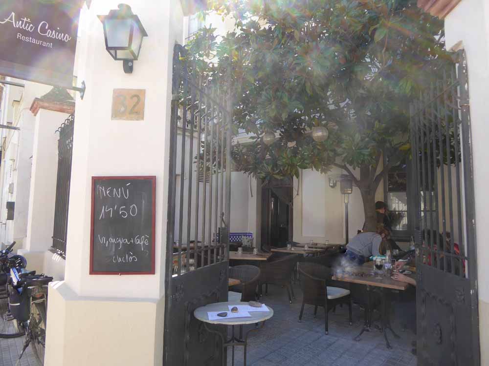 After walking the old quarter, and rehydrating with coke and beer, we cycled down the hill for lunch in the Antic casino. This I think translates as ‘The Old Casino’. It was recommended by Jean, a friend we met at the campsite, and it was indeed a scrumptious meal. I had chicken and mushroom risotto and Nia feasted on beef wrapped in a very thin pastry in a rich sauce.