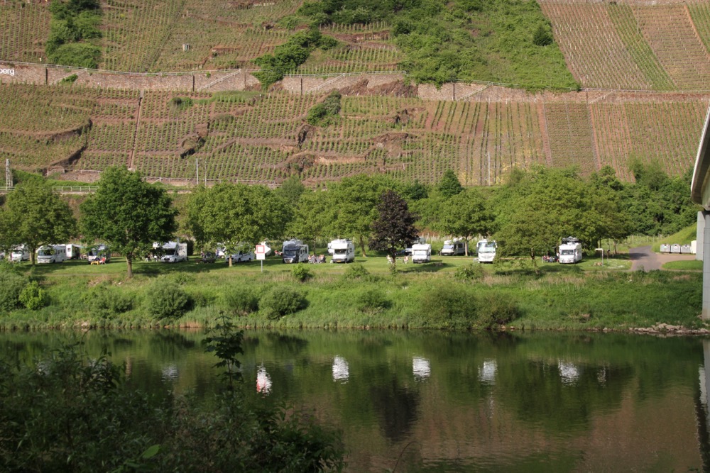 The Neef stellplatz is a large expanse of grass about ¼ mile from the tiny town of Neef and overlooked by the typical Moselle sloping vineyards, extending up the valley side. There are a lot of motorhomes parked here today; we worked out eventually that the good weather and the bank holiday had bought everyone out for the long weekend. There are steps up the valley side from Neef and these make a great early morning walk with the dogs.