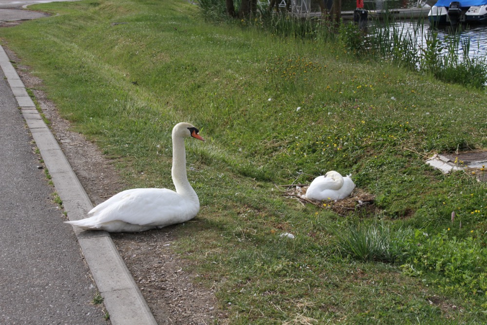 A scene of domestic bliss by the aire. Mr Swan is guarding the nest while his Mrs nods off on the family eggs.