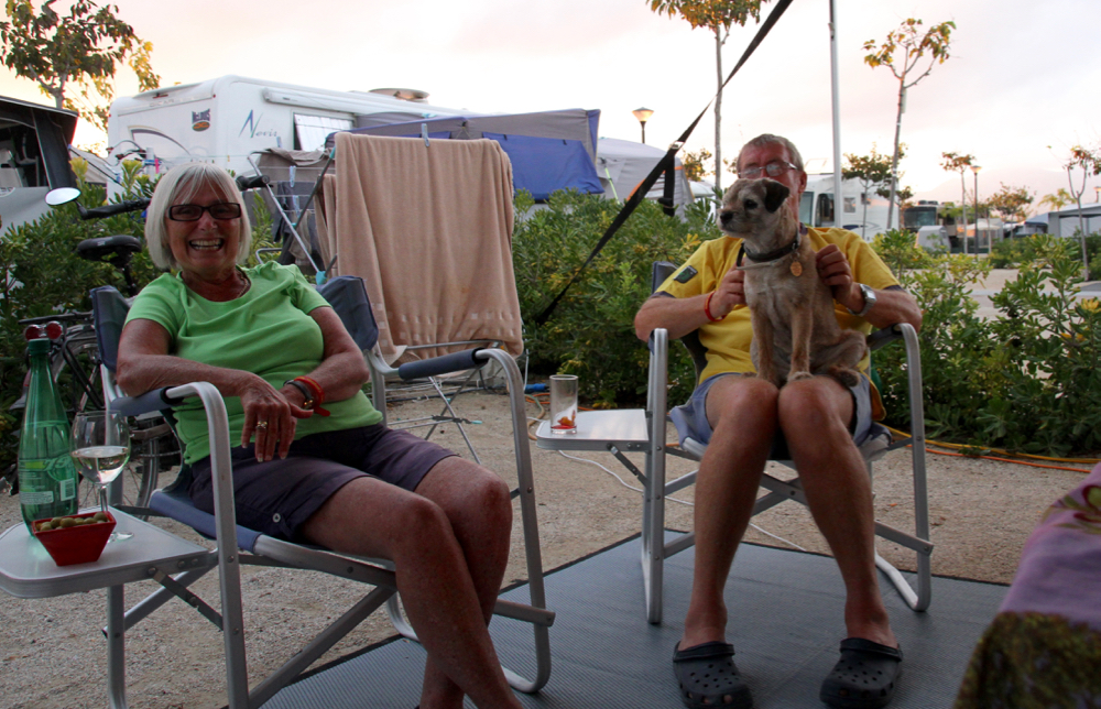 We’ve had a few evening drinks with Adrian and Jan, our neighbours. Colin is trying to persuade Adrian to feed him tapas, using the jumping up and looking cute technique.