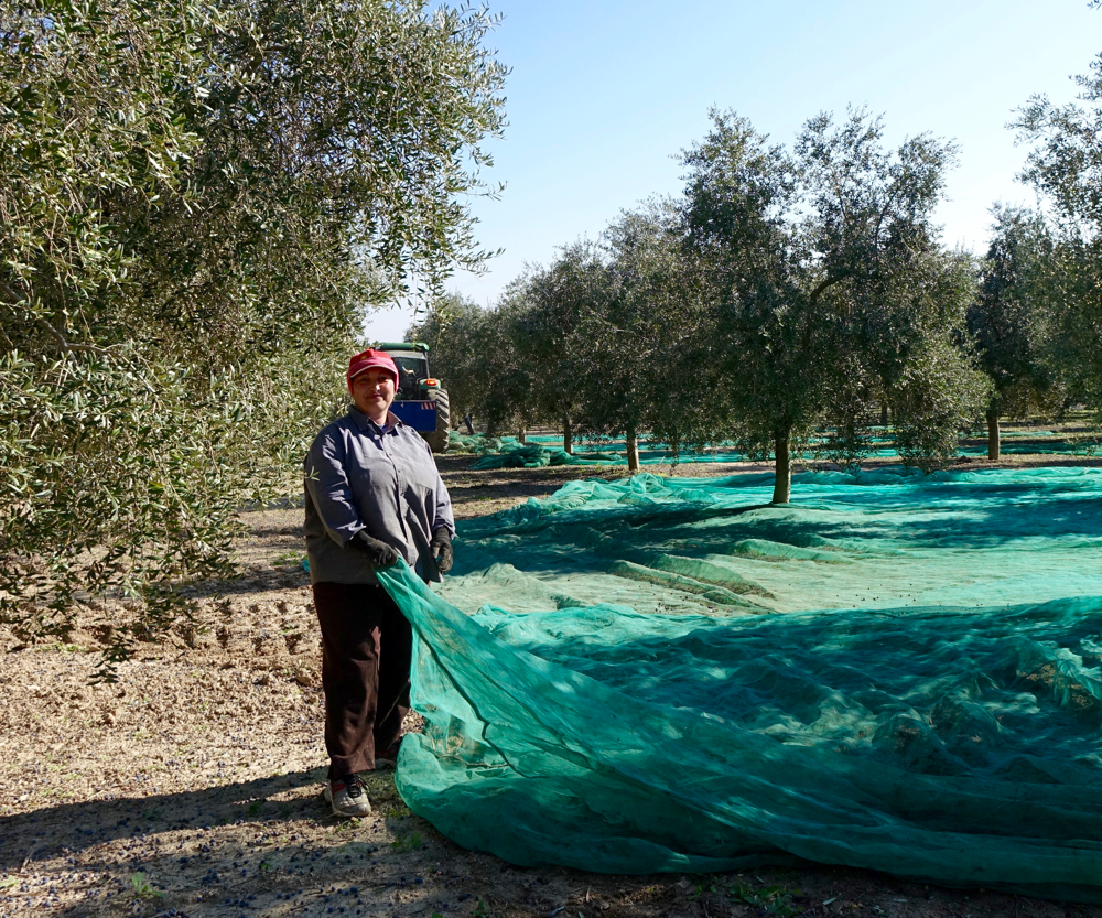 This guy picks up the nets and pulls the olives into a big hopper on the front of one of the tractors.