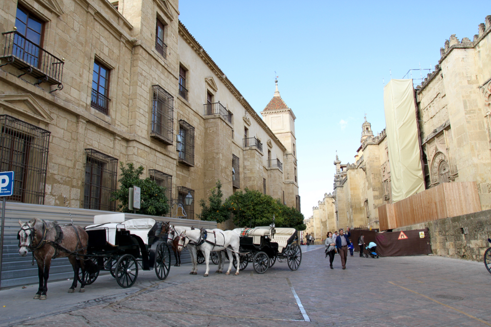Horses and carriages are drawn up next to the Bishop’s palace, over the road from the Mezquita, ready to ferry visitors around.